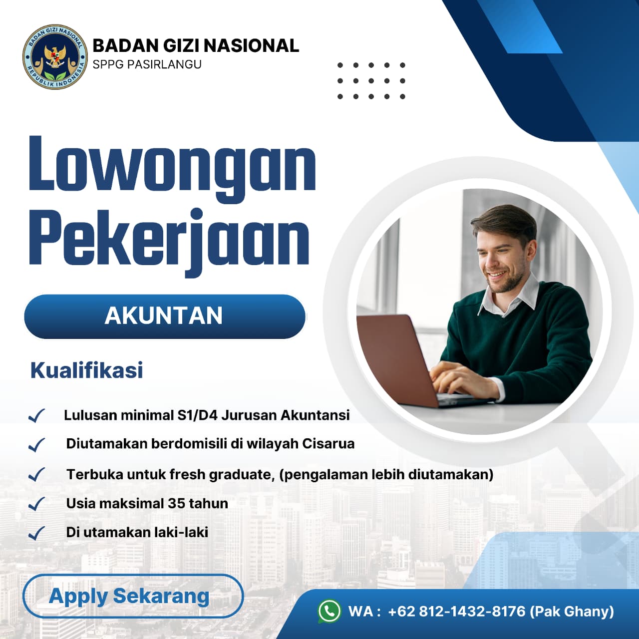 Dibutuhkan Segera Akuntan: Untuk Dapur SPPG (Satuan Pelayanan Pemenuhan Gizi) / Makan Bergizi GratisLokasi Penempatan: Cisarua, Bandung Barat Kualifikasi: * Lulusan minimal S1/D4 Jurusan Akuntansi dengan gelar S.Ak, S.Tr.Ak, S.E (Akuntansi) * Diutamakan berdomisili di wilayah cisarua Kab. Bandung Barat atau sekitarnya * Terbuka untuk fresh graduate, pengalaman kerja lebih diutamakan * Usia maksimal 35 tahun * Memiliki pemahaman budgeting, cost control, dan management warehouse * Jujur, bertanggung jawab, dan berintegritas tinggi * Menguasai MS Office (terutama Excel dan Word) * Mampu bekerja di bawah tekanan dan menyelesaikan tugas tepat waktu * Teliti, disiplin, dan memiliki komitmen terhadap ketepatan data * Diutamakan laki-laki Kirimkan CV dan Lamaran Anda ke : [email protected]