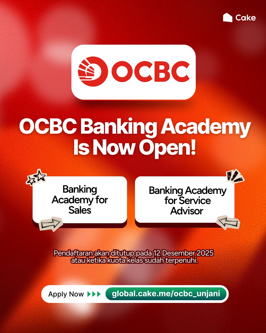 OCBC Indonesia Banking Academy kini resmi dibuka! ???????? Program pelatihan komprehensif ini dirancang untuk mempersiapkan talenta muda memasuki dunia perbankan dengan keterampilan yang solid dan pengalaman yang berharga. Pilihan program yang tersedia: ???? Banking Academy for Sales ???? Banking Academy for Service Advisor ???? Pendaftaran ditutup pada 12 Desember 2025 atau ketika kuota kelas telah terpenuhi. ???? Daftar sekarang: global.cake.me/ocbc_unjani Bangun fondasi karier perbankanmu bersama OCBC langkah awal menuju masa depan yang lebih cerah! ????