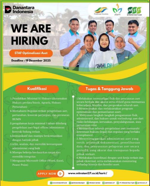 PT Mitratani Dua Tujuh memberikan kesempatan untuk dapat bergabung bersama dengan posisi sebagai berikut: Staf Optimalisasi Aset